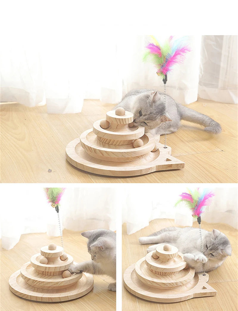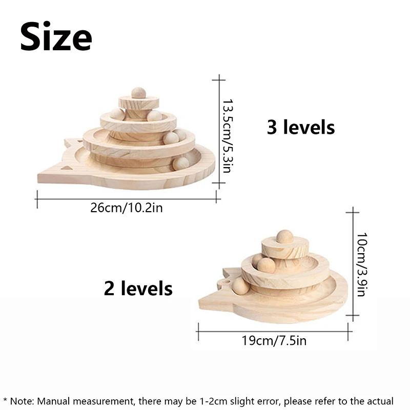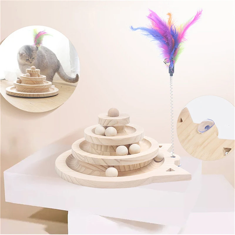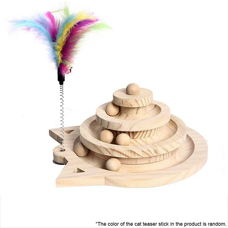 Holz 2/3-stöckiger Katzen-Spielturm mit Scheiben – Intelligenzfördernde Spielbahn für Katzen, Triple-Disc-Spielzeug, Ball-Training